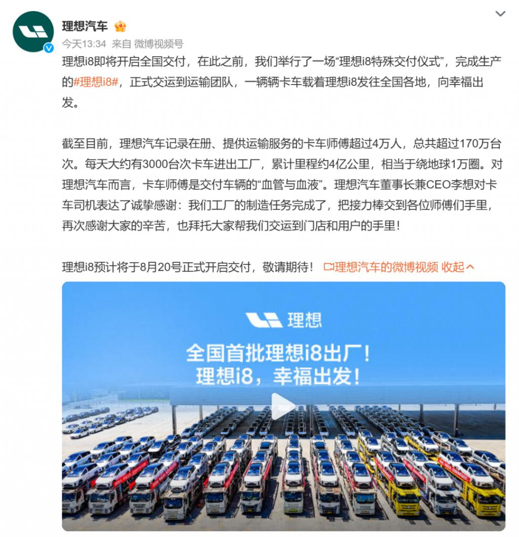 8 月 18 日,理想汽车举行发运仪式,标志着理想 i8 正式进入全国交付前的运输阶段。