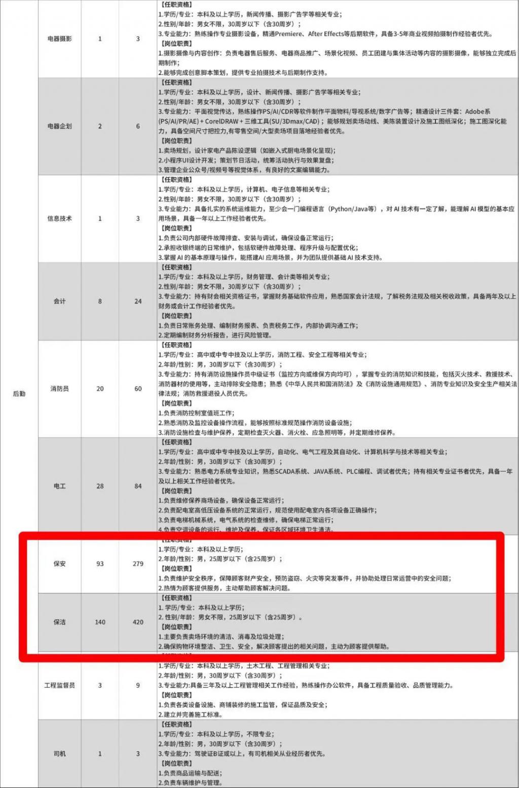 8 月 18 日,胖东来商贸集团发布《新乡胖东来招聘公告》,对新店招聘的基础标准、具体岗位、岗位的要求、报名安排及面试安排等事项做了规定。其中,在保安、保洁岗位一栏,要求招聘人员具有本科及以上学历,年龄 25 周岁以下(含 25 周岁)。