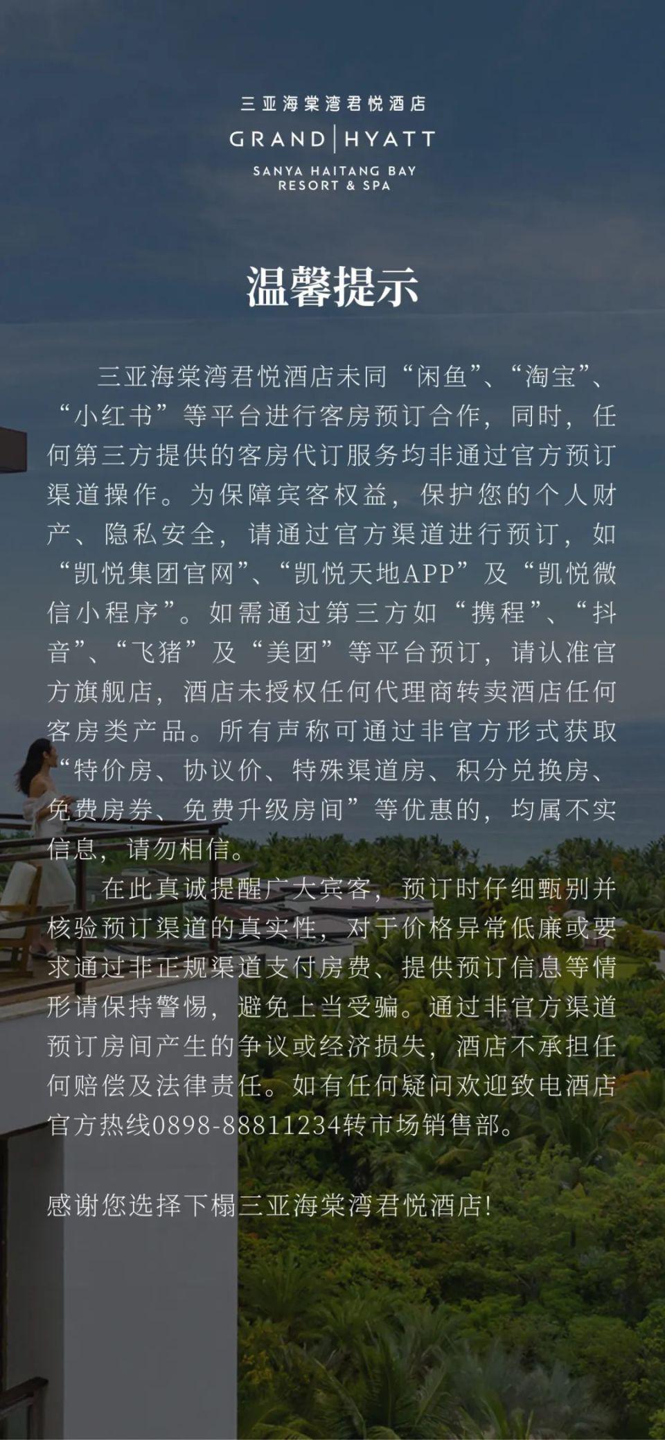 此前三亚海棠湾君悦、深圳康莱德、青岛威斯汀等高端酒店开始打击非授权渠道虚假销售以及宣传行为,声明显示,酒店未同 " 闲鱼 "、" 淘宝 "" 小红书 " 等平台进行客房预订合作," 真诚提醒广大宾客,预订时仔细甄别并核验预订渠道的真实性,对于价格异常低廉或要求通过非正规渠道支付房费、提供预订信息等情形请保持警惕,避免上当受骗。通过非官方渠道预订房间产生的争议或经济损失,酒店不承担任何赔偿及法律责任。还有消费者在社交平台晒图,沈阳康莱德酒店、杭州君悦酒店都发布了相关公告提醒。