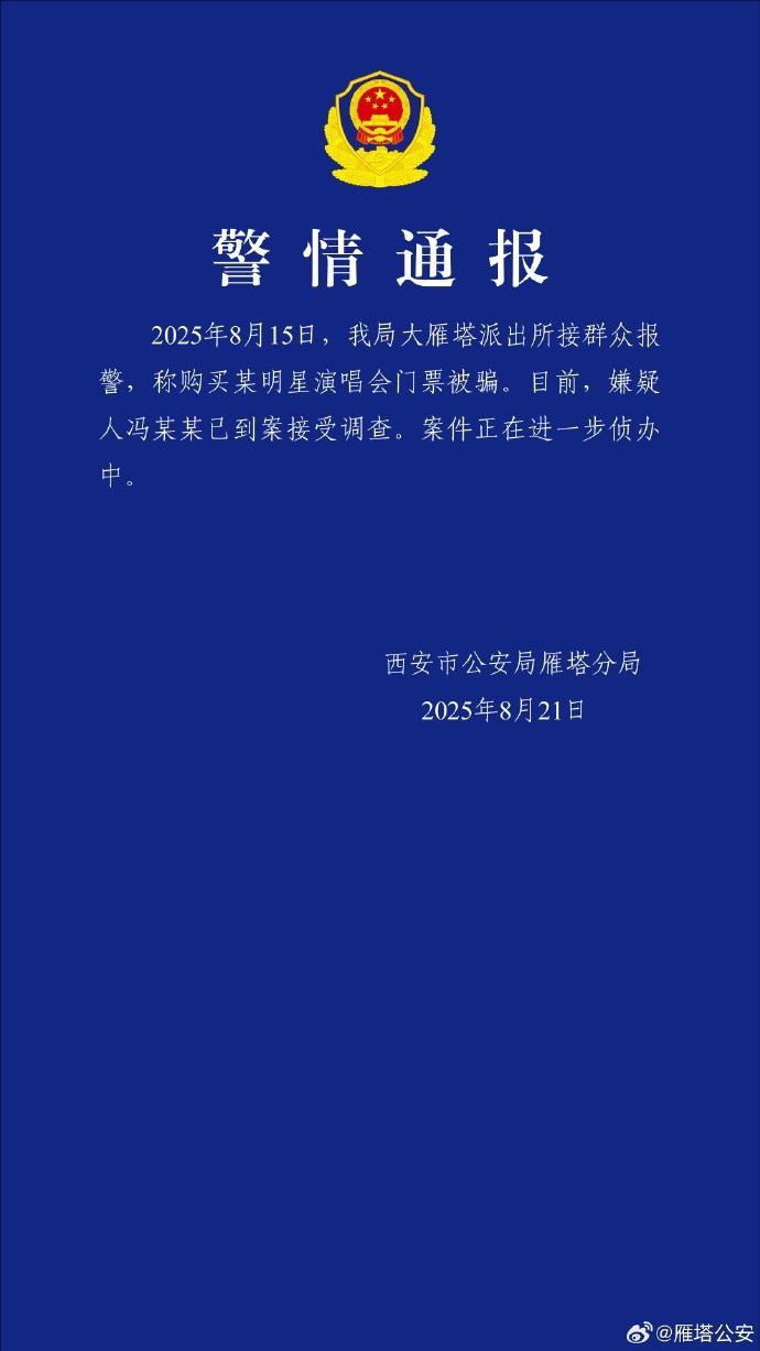 2025 年 8 月 15 日,我局大雁塔派出所接群众报警,称购买某明星演唱会门票被骗。目前,嫌疑人冯某某已到案接受调查。案件正在进一步侦办中。