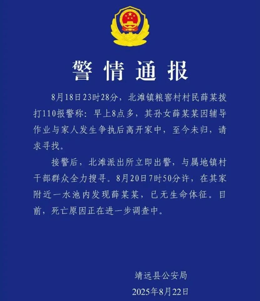 甘肃靖远县公安局在警情通报中还原了事件经过:8 月 18 日 23 时 28 分,北滩镇粮窖村村民薛某拨打 110 报警称:早上 8 点多,其孙女薛某某因辅导作业与家人发生争执后离开家中,至今未归,请求寻找。接警后,北滩派出所立即出警,与属地镇村干部群众全力搜寻。8 月 20 日 7 时 50 分许,在其家附近一水池内发现薛某某,已无生命体征。目前,死亡原因正在进一步调查中。