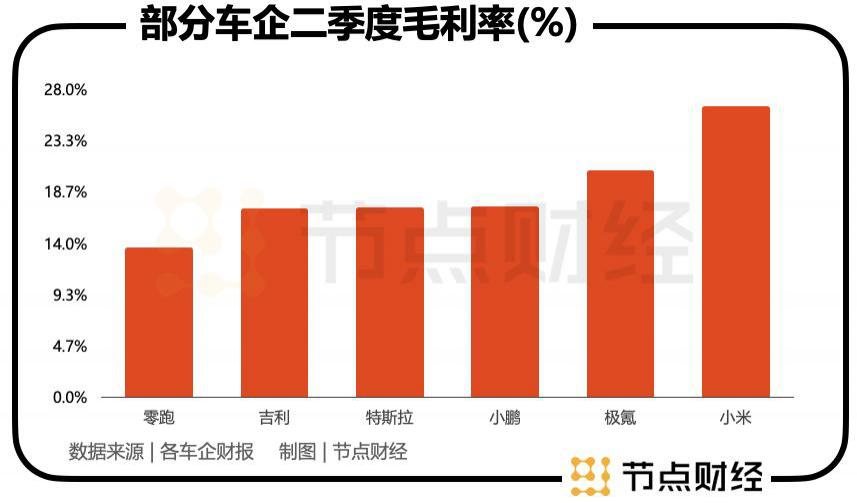 作为参考,2025 年第二季度,极氪、小鹏、特斯拉、吉利、零跑的毛利率分别为 20.6%、17.3%、17.2%、17.1%、13.6%。