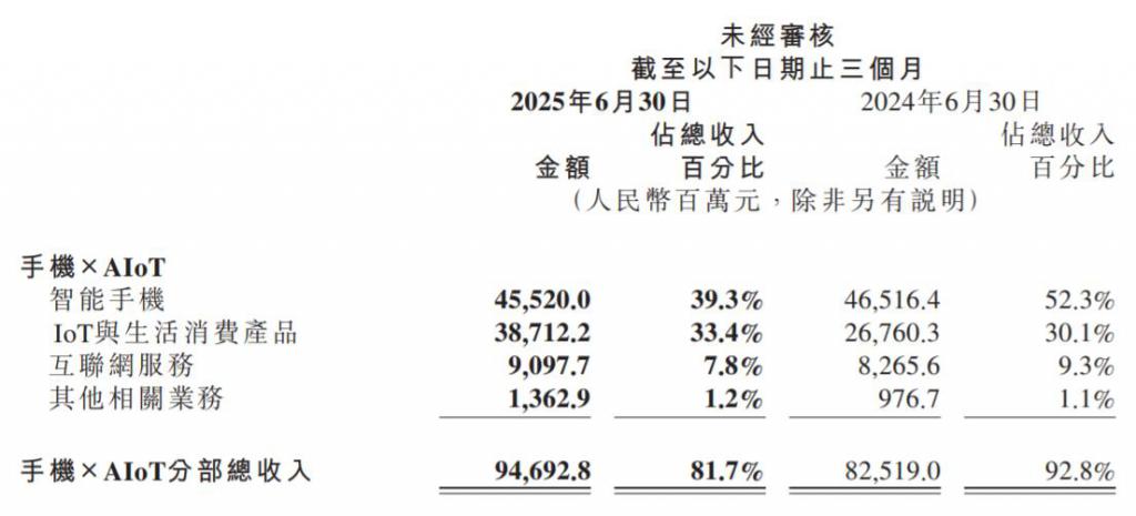 2025 年第二季度,小米智能手机业务营收 455.2 亿元,同比下降 2.1%,环比下降 10.1%,占比也从今年 Q1 的 45.5% 缩小至 39.3%。