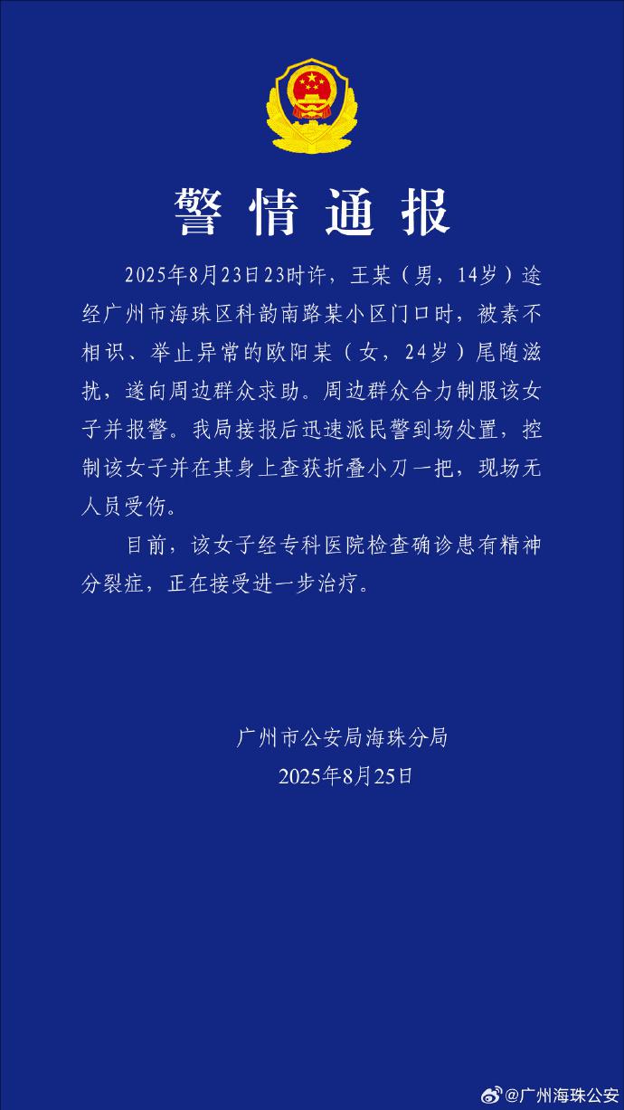 广州市公安局海珠分局通报,8 月 23 日 23 时许,王某(男,14 岁)途经广州市海珠区科韵南路某小区门口时,被素不相识、举止异常的欧阳某(女,24 岁)尾随滋扰,遂向周边群众求助。周边群众合力制服该女子并报警。警方接报后迅速派民警到场处置,控制该女子并在其身上查获折叠小刀一把,现场无人员受伤。