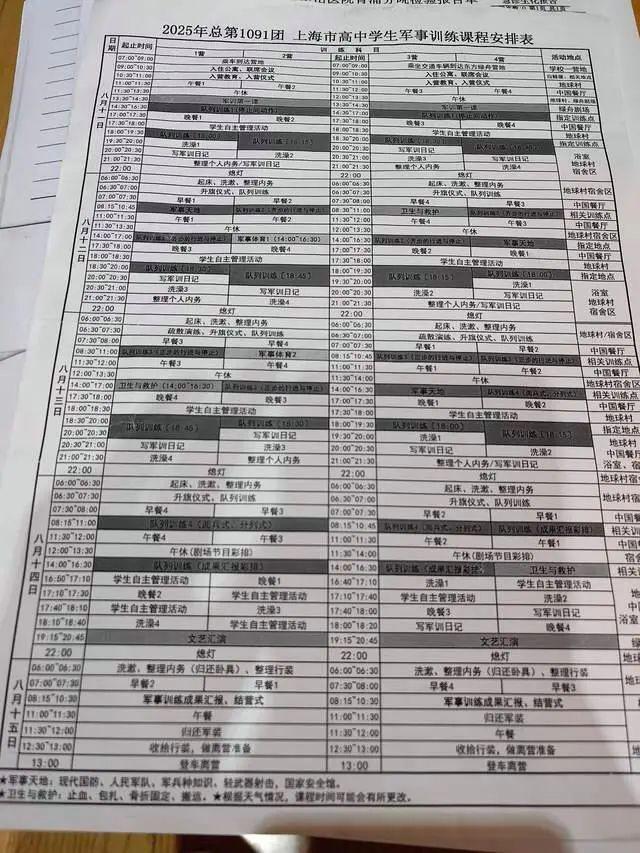 根据《军训课程安排表》显示,8 月 11 日,学生抵达营地。8 月 14 日的训练计划为:6 时起床,半小时整理内务;6 时 30 分至 7 时 30 分,参加升旗仪式;后学生吃早餐;8 时 15 分至 11 时,进行 2 小时 45 分的队列训练;午餐后,12 时至下午 1 时 30 分,午休或剧场节目彩排。下午 2 时至 4 时 30 分,继续队列训练。