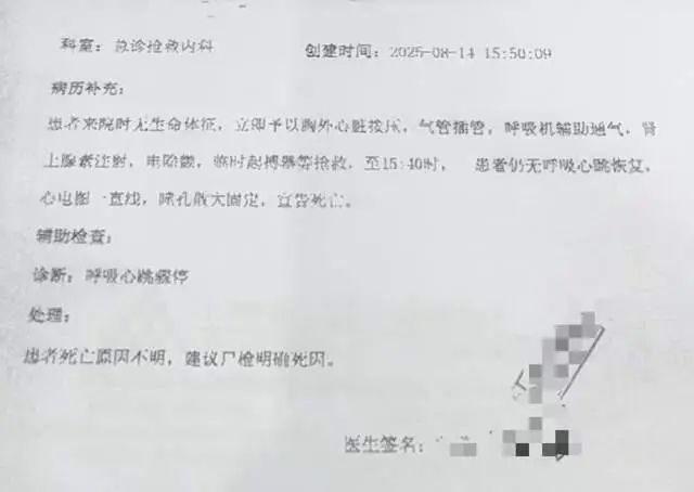 根据医院病历显示," 患者来院时无生命体征,立即予以胸外心脏按压,气管插管,呼吸机辅助通气,肾上腺素注射等抢救,至下午 3 时 40 分时,患者仍无呼吸心跳恢复,瞳孔散大固定,宣告死亡。"诊断为 " 呼吸心跳骤停 "," 死亡原因不明,建议尸检明确死因。"