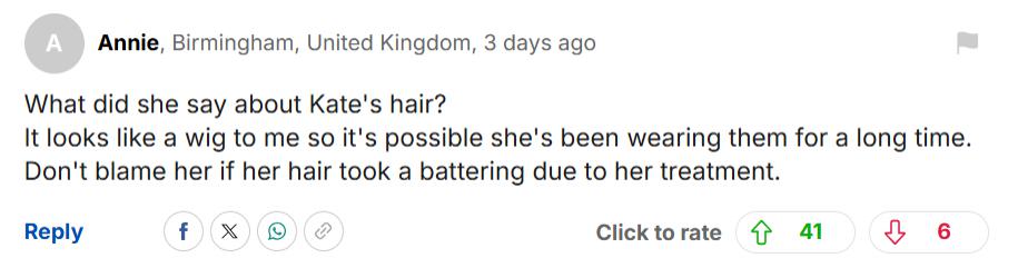 无论英国王室是哪种考虑,不少网友们对于这件事的态度,还是坚持此前的看法,认为凯特就是化疗出现问题,佩戴假发是不得已才考虑的选择。