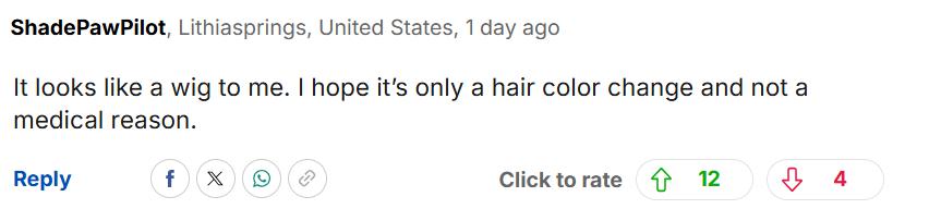 " 对我来讲,这东西看上去就像假发。我希望她只是头发染了色,而不是因为健康问题。"