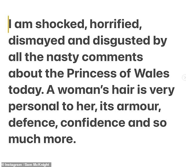 很快,曾为戴安娜王妃服务过的发型师在自家的社媒账号发表文章称,外界对凯特佩戴假发的猜测非常不礼貌也很过分。