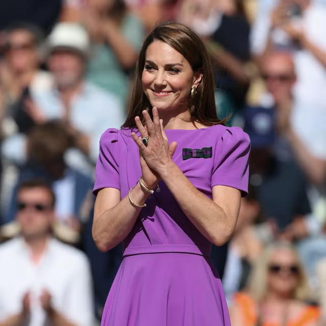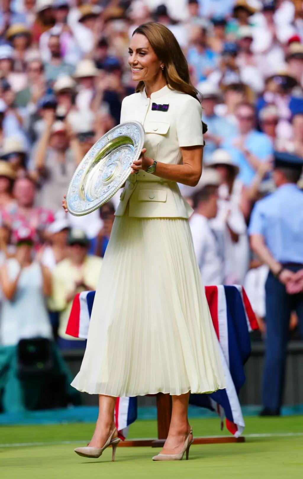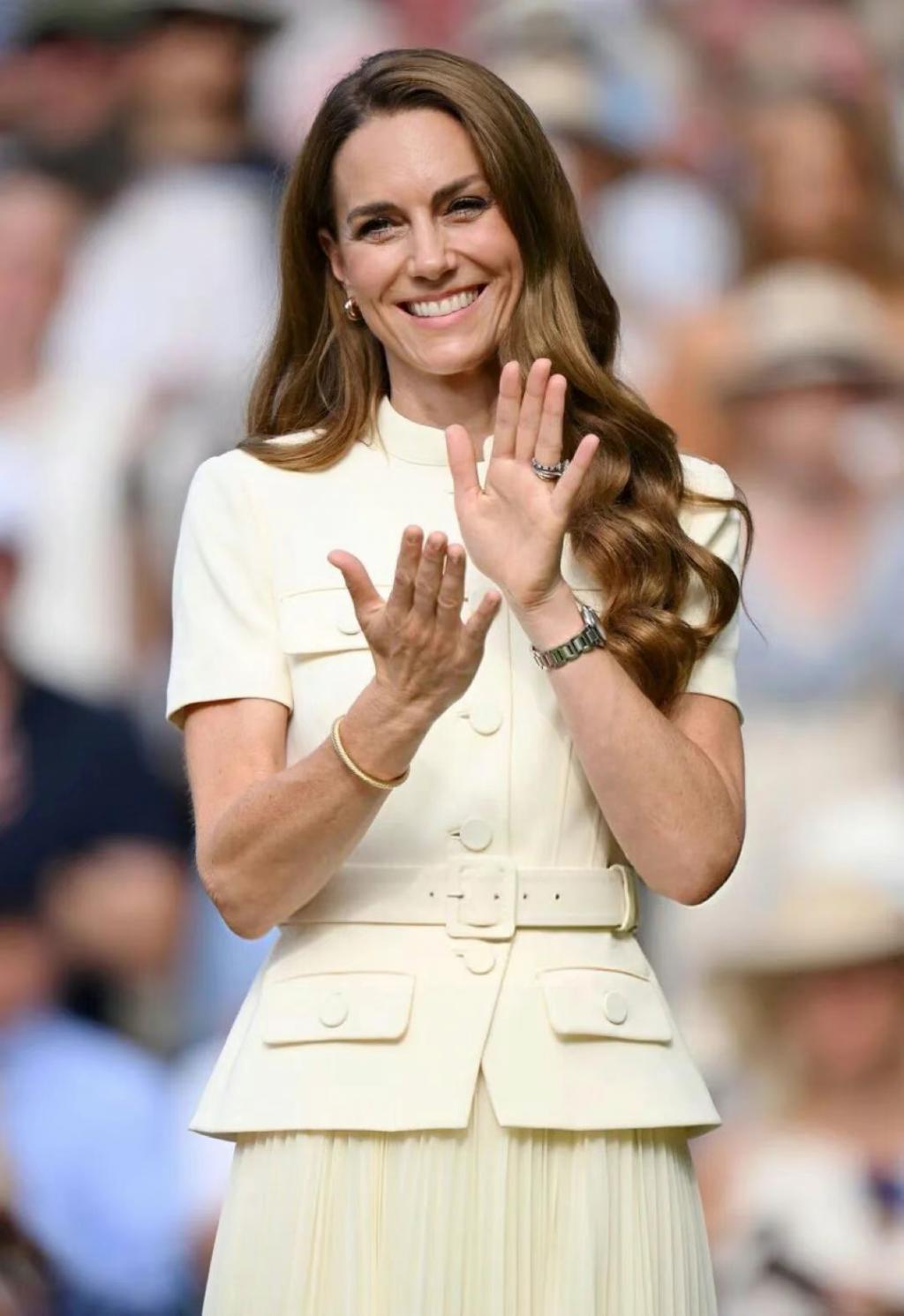 今年 7 月,凯特穿着一身白色套装现身温网女单的决赛现场。