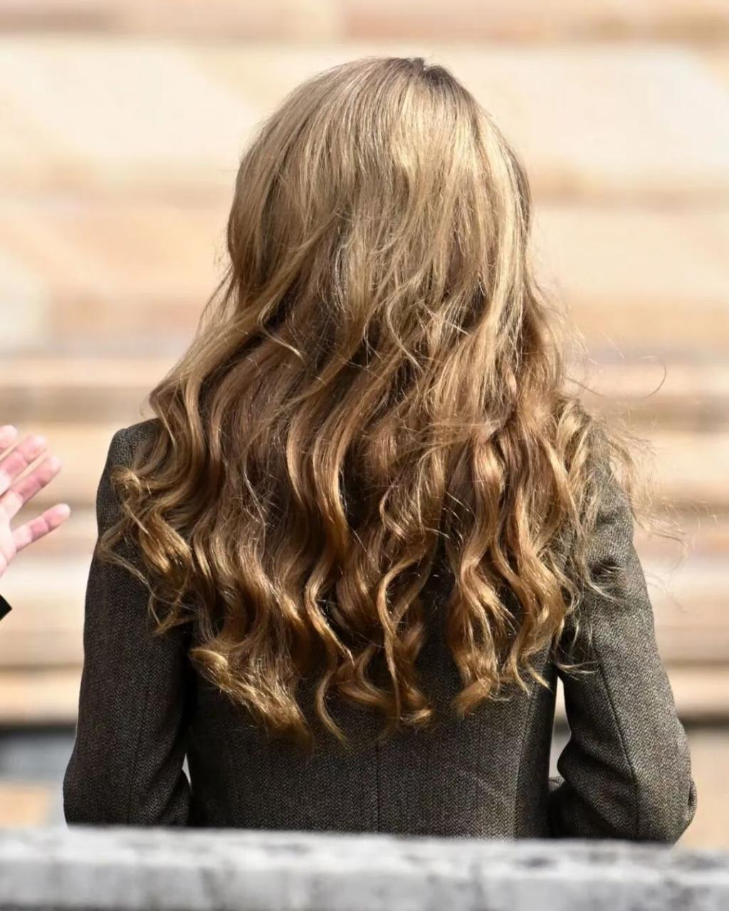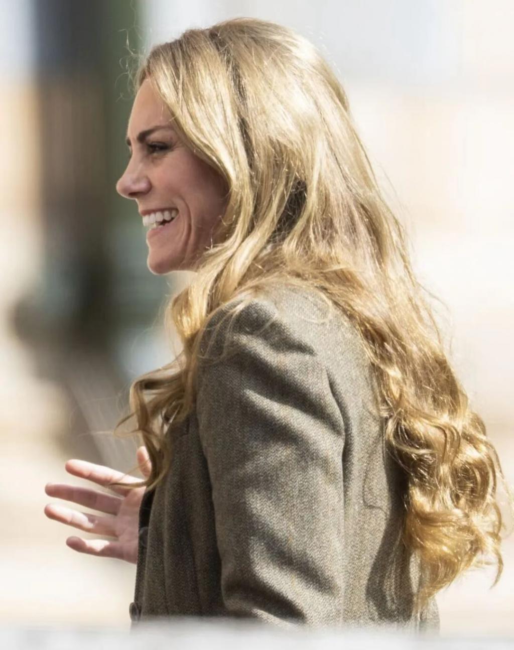 更扎眼的是,凯特一头标志性的天然深棕长发不见了。取而代之的是长至腰间、遮住耳朵的浅金色长发。