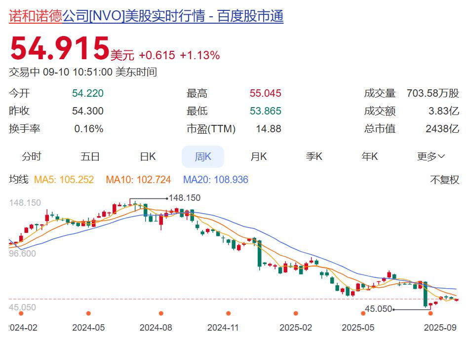 不过,由于来自全球市场竞争对手日益增长的压力,诺和诺德过去一年来股价下跌近 60%,今年内跌超 30%,目前市值仅剩 2410 亿美元,较一年前蒸发超 3500 亿美元(约合人民币 2.5 万亿元)。