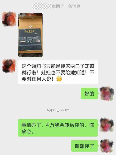 6 月 15 日," 当时她发来两张照片,第一张是通知书封面,第二张印着我女儿的名字和学籍号。" 曹女士向记者展示她与李某的聊天记录,点开照片原图,一封印有学校名称的通知书赫然在目。这份 " 录取通知书 " 是打动她的关键一击,曹女士最终痛下决心:交钱。