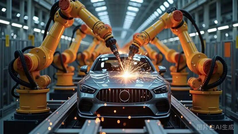以及," 一条高度精密的汽车生产线,无数机械臂在协同工作,焊接时火花四溅,充满工业美感。"