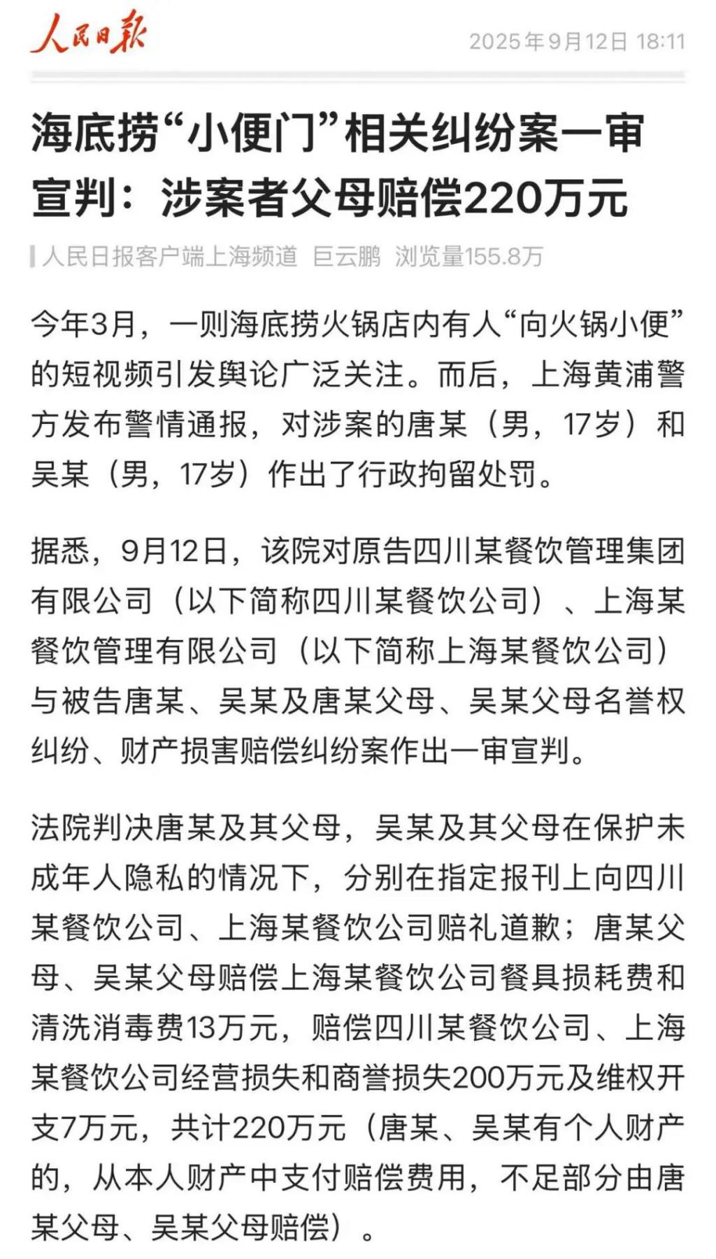 海底捞“小便门”相关纠纷案一审宣判:涉案者父母赔偿220万元