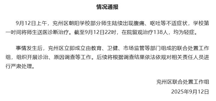 新京报讯 9 月 12 日,山东济宁兖州区联合处置工作组发布情况通报,9 月 12 日上午,兖州区朝阳学校部分师生陆续出现腹痛、呕吐等不适症状,学校第一时间将师生送医诊断治疗。截至 9 月 12 日 22 时,在院留观治疗 138 人,均为轻症。