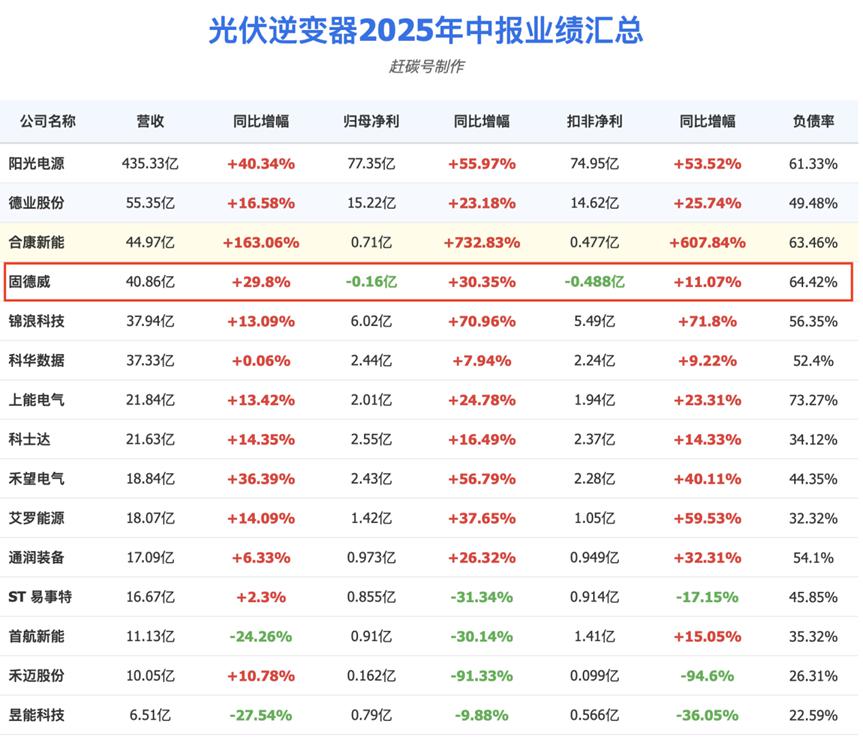 此前,固德威是 2024 年 A 股逆变器板块中唯一亏损的企业。2025 年上半年,固德威实现营收 40.86 亿,归母净利润亏损 1660 万。值得庆幸的是一季度亏损了 2803 万,也就是说,二季度公司赚了 1100 多万。