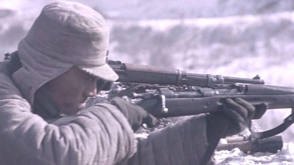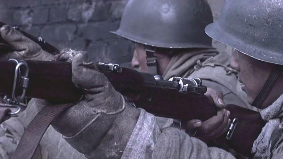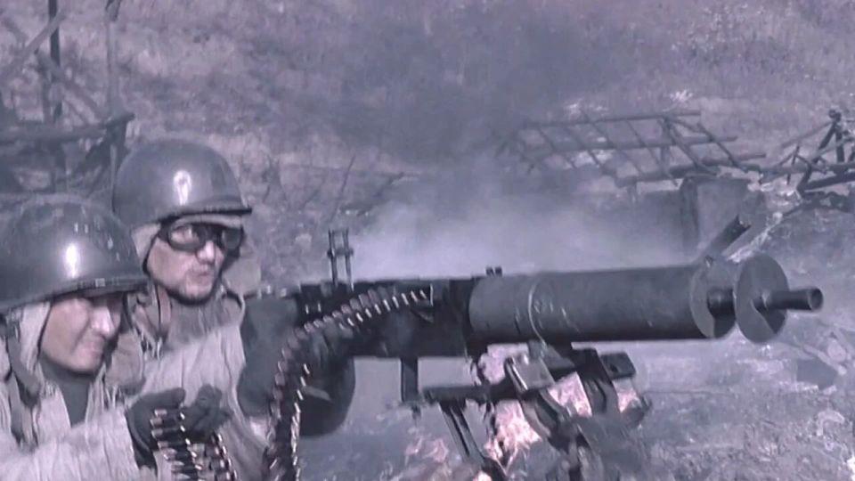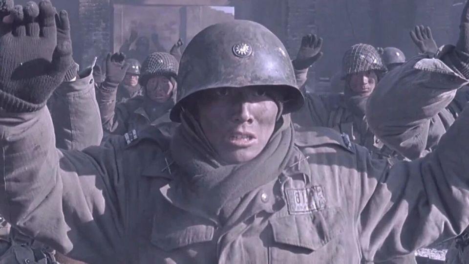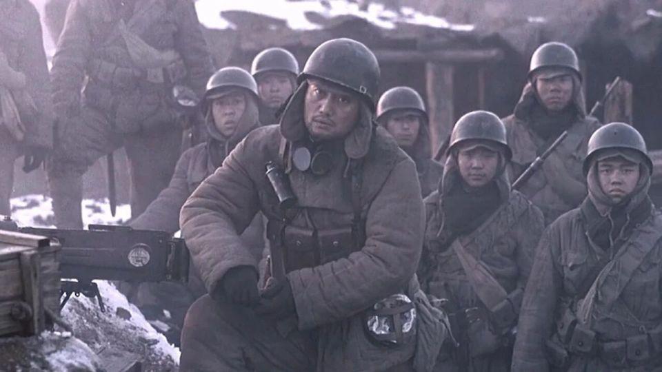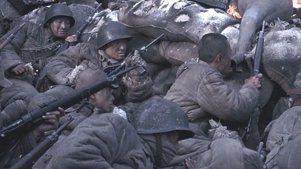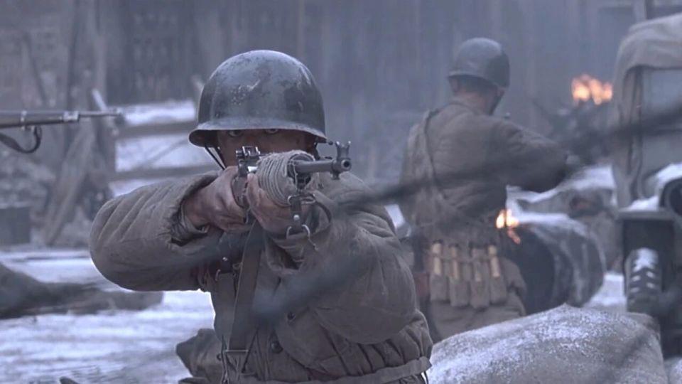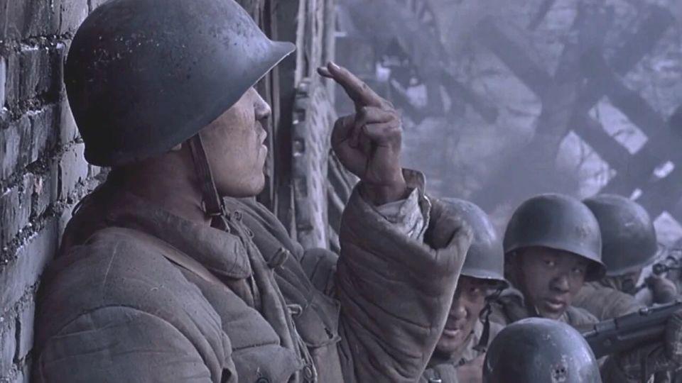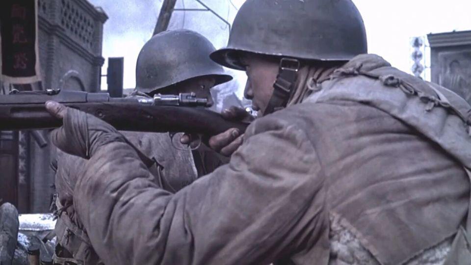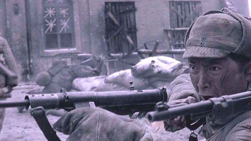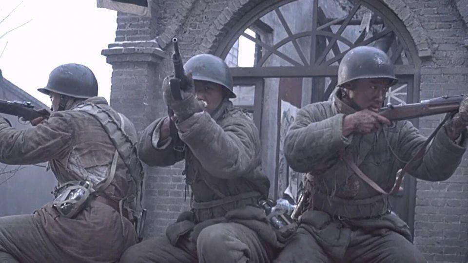 然后就是 6 人进去摸点,不知道大家看这一段是什么感觉?本片的动作指导是来自韩国的朴柱天,他担任动作指导的影片还包括《登陆之日》和《长津湖之水门桥》,我个人认为这些战术动作、持枪姿态、手势并不适用于那个年代的战争戏,而且有几个士兵厚厚的手套甚至都遮挡了步枪的正常瞄准,最接近解放战争的影片《南征北战》中解放军持枪据枪跃进的动作就非常标准,如果没有概念的朋友可以参考一下;
