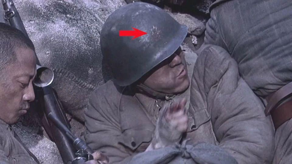 这里只有部分人佩戴了钢盔,而且从钢盔正面的擦痕表明,可能是刚从国民党军手中缴获临时抠掉了青天白日徽,这里没有不妥,但如果换成日式 90 盔更好,后面守旧窑场阵地时解放军几乎人手一顶 M1 钢盔看着有些别扭。