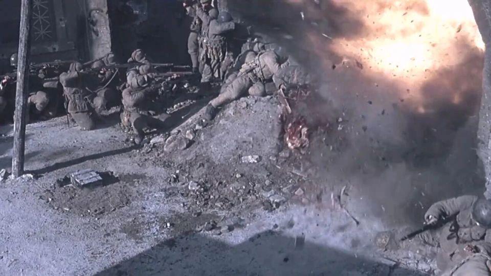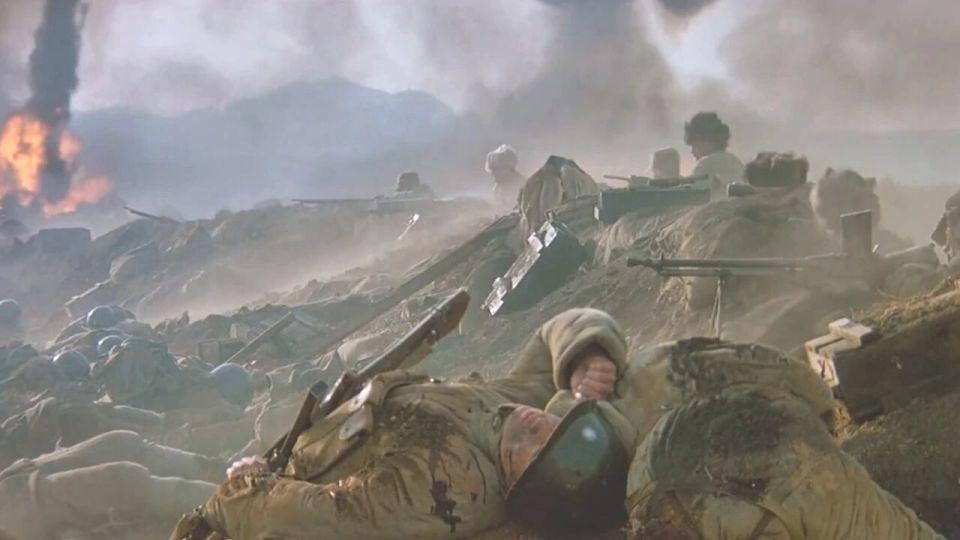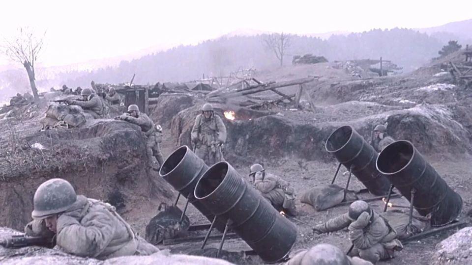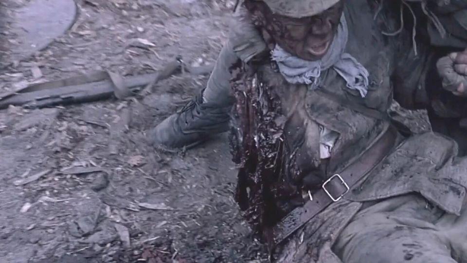 这一段的亮点是表现出了战场 " 残肢断臂 " 的血腥场景,尤其是任泉饰演的指导员被人炸成两截,这个化妆效果就当时的国产战争片而言是非常震撼的,当然这些烟火和特效是来自韩国的团队完成,他们曾参与 04 年的韩国战争片《太极旗飘扬》的拍摄。