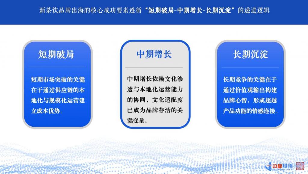 《报告》认为,新茶饮品牌出海的核心成功要素是遵循了 " 短期破局 - 中期增长 - 长期沉淀 " 的递进逻辑。短期市场突破的关键在于通过供应链的本地化与规模化运营建立成本优势。中期增长依赖文化渗透与本地化运营能力的协同,文化适配度已成为品牌存活的关键变量。长期竞争的关键则在于通过价值观输出构建品牌心智,形成超越产品功能的情感连接。
