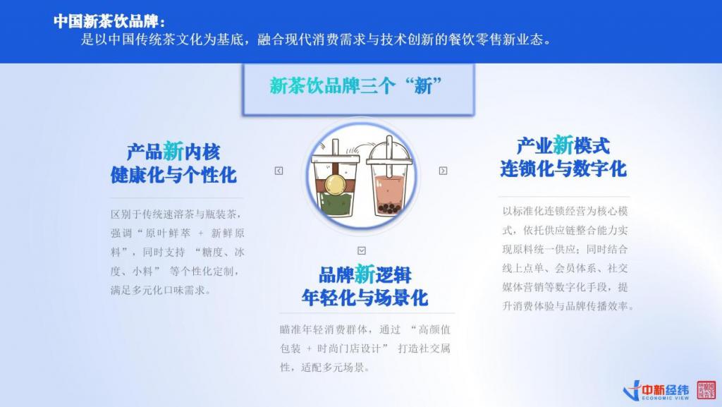 根据《报告》,新茶饮品牌与传统茶饮品牌存在诸多不同。在产品内核方面,新茶饮品牌更强调健康化与个性化。其强调 " 原叶鲜萃 + 新鲜原料 ",并支持个性化定制,满足多元化口味需求。在品牌逻辑方面,新茶饮品牌更注重年轻化与场景化。通过 " 高颜值包装 + 时尚门店设计 " 打造社交属性,适配多元场景。在产业模式方面,新茶饮品牌更加注重连锁化与数字化经营。以标准化连锁经营为核心模式,依托供应链整合能力实现原料统一供应;同时结合线上点单、会员体系、社交媒体营销等数字化手段,提升消费体验与品牌传播效率。