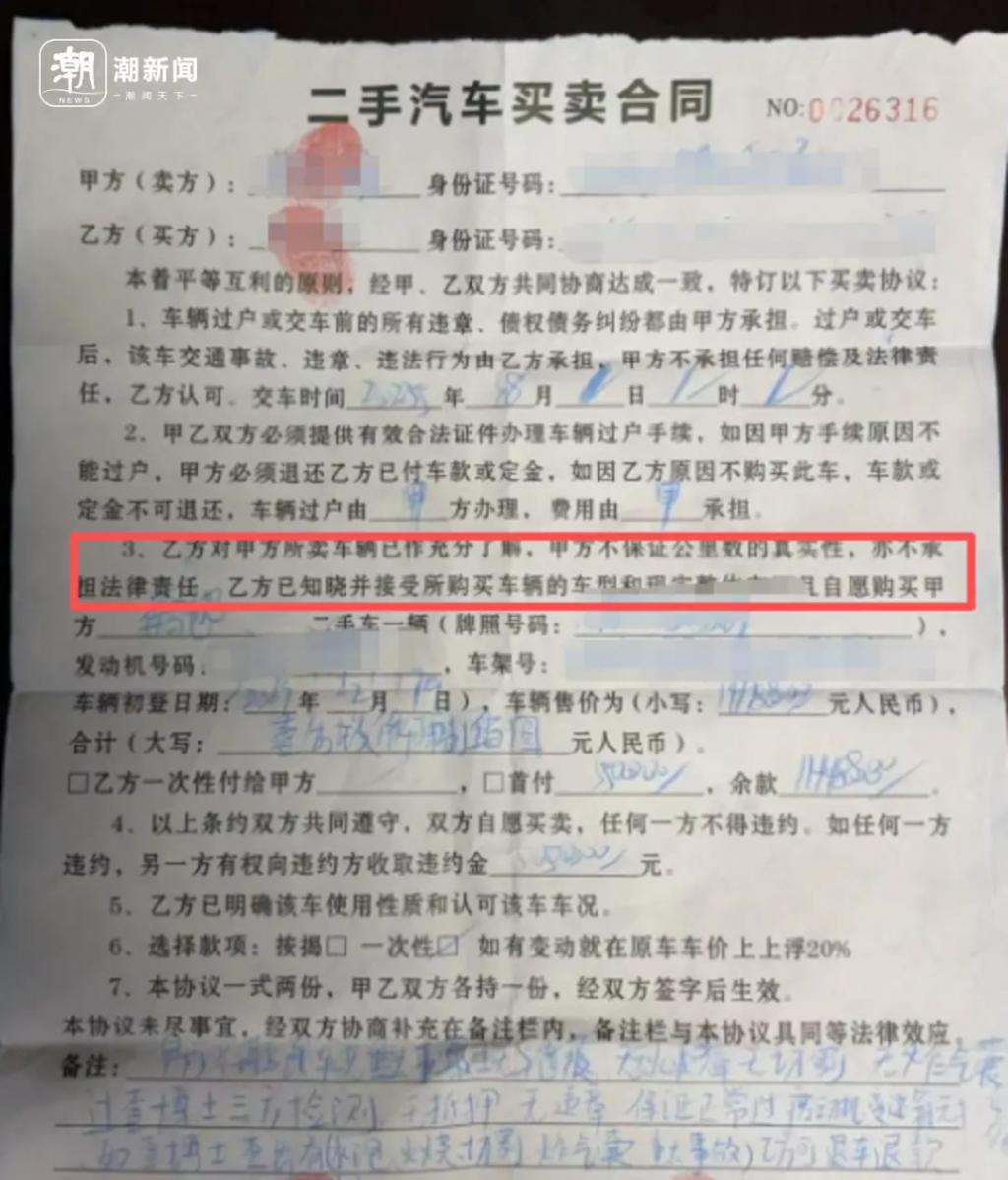 值得注意的是,在杨旭和二手车商签订的合同中,有个条款写道:" 乙方对甲方所卖车辆已作充分了解,甲方不保证公里数的真实性,亦不承担法律责任。"