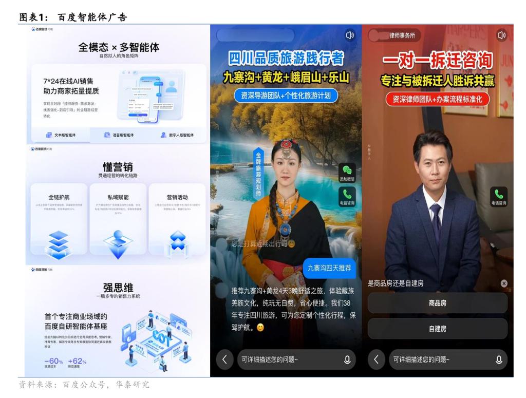 探索 AI 新广告: 积极部署以 Agent(智能体)和数字人为代表的新型广告形式。这一模式已展现出强劲的商业化潜力,其带来的广告佣金收入在 2025 年第二季度已达到百度核心广告收入的 16%,对应金额约 26亿元人民币,且环比增长超过 50%。据百度公众号数据,采用深度转化目标后,商家线索有效率平均提升 22%,到店成本降低 64%。