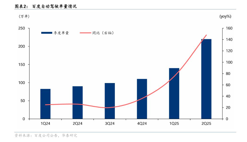 华泰研究在报告中强调了百度的成本优势。百度 6 代车整车成本相较 5 代车下降 60%,价格约 20 万元人民币,明显低于 Waymo 5 代车约 17.5 万美元的成本。在订单量上,2Q25 百度萝卜快跑提供超过 220 万次完全无人驾驶行程,同比增长 148%,接近 Waymo 峰值 25 万单的水平。