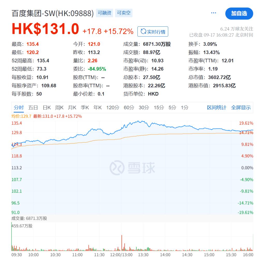 随着 AI 大模型能力持续迭代和 AI 应用不断渗透,百度旗下自动驾驶业务、昆仑芯业务、百度文库及百度网盘等具备 AI 功能的软件应用,有望在体量规模持续扩大过程中被重新定价。华泰证券夏路路研究团队在 14 日发布的研报中,调整该股 SOTP 估值组成,将其美股目标价上调至 243.1 美元,港股目标价 236.0 港元,维持 " 买入 " 评级。截至发稿,百度港股股价为 131 港元 / 股,较目标价有约 80% 的上涨空间。