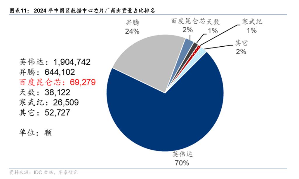 自研芯片能力将成为百度区别于其他云服务厂商的差异化优势。据 IDC 数据,2024 年中国区数据中心芯片厂商出货量排名中,百度以 6.9 万颗排名第三,位于英伟达和昇腾之后,领先寒武纪的 2.6 万颗。