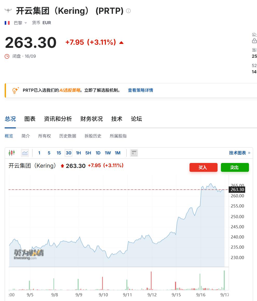 近期开云集团股价有所回升,近一周内涨超 10%。