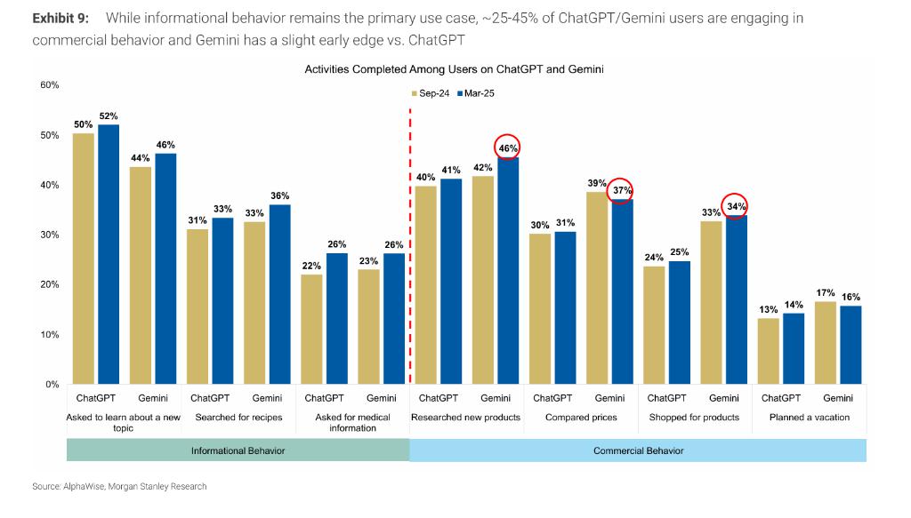 报告指出,谷歌在 AI Overviews、AI Mode 等方面的创新有望推动搜索收入加速增长,其预测 2025 年下半年和 2026 年的搜索收入增速分别为 12% 和 9%。摩根士丹利的调查数据显示,在产品研究和比价等商业行为上,谷歌依然是消费者的首选平台,领先于亚马逊及其他竞争者。