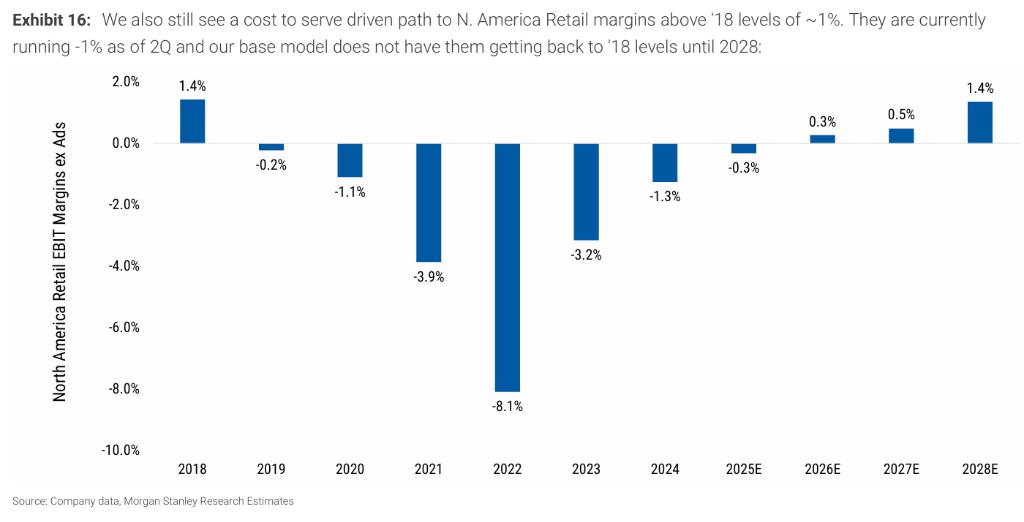 在零售业务方面,报告指出,亚马逊北美零售业务的利润率仍有显著提升空间。截至 2025 年第二季度,该业务利润率为 -1%,远低于 2018 年约 1% 的水平。摩根士丹利的基础模型预计到 2028 年才能恢复至 2018 年水平,这意味着其 2026/2027 年每股收益预测存在进一步上调的可能。