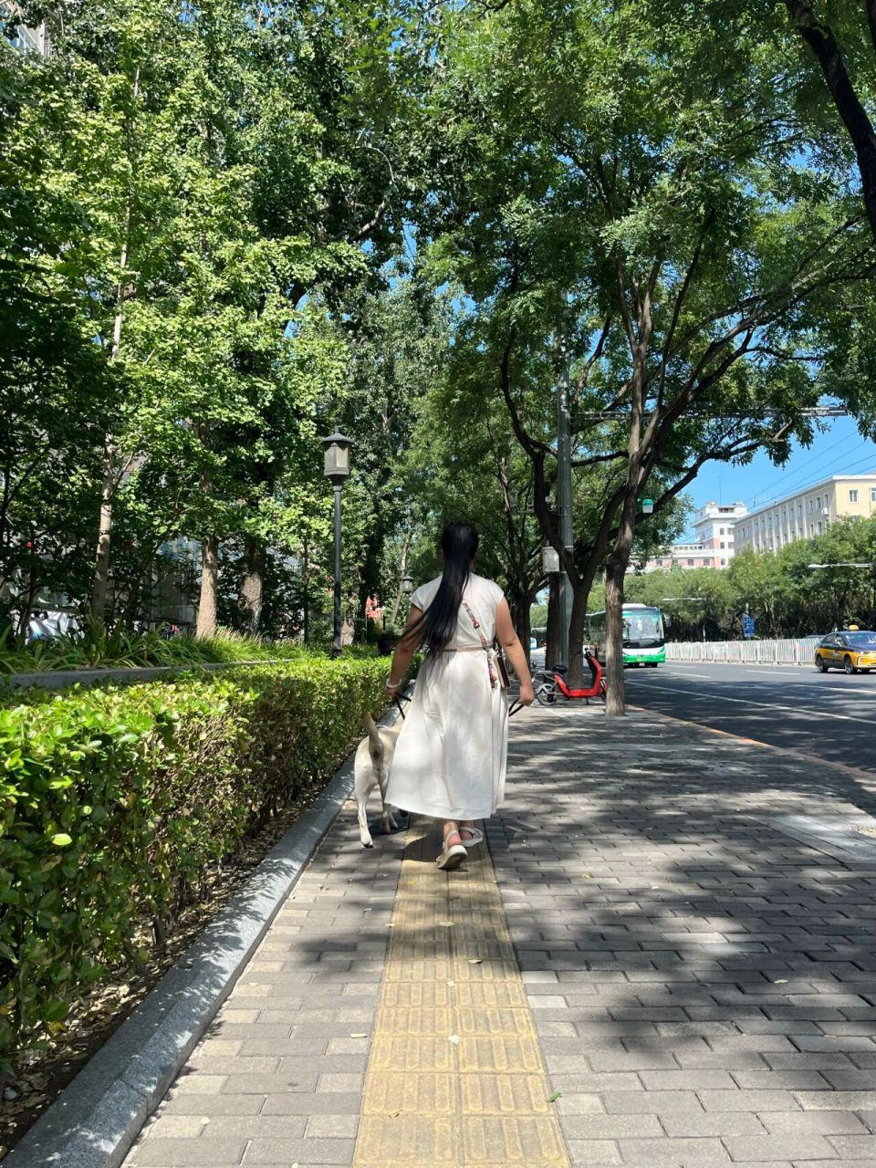 ▲ 9 月 19 日,王营营带芬迪出门上厕所。 新京报记者 秦冰 摄