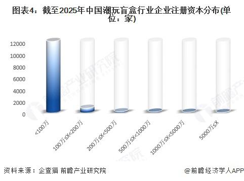 根据企查猫查询数据显示,截至 2025 年 8 月,中国潮玩盲盒企业的注册资本主要分布在 100 万元以下,相关企业数量约 1.8 万家,占比约达 94%; 其次是 100-200 万元之间的企业,相关企业数量为 757 家,占比 4%。其他区间的企业数量相对较小。整体来看,当前潮玩盲盒行业处于成长期,未形成成熟体现,业内企业的规模小队较小。