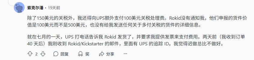 以 UPS 清关费用为例:有用户反馈,除了被收取 150 美元的进口关税外,还被 UPS 额外加收了 100 美元的关税处理费,而这些费用在付款前从未被明确告知。Rokid 在申报过程中将货值标注为 100 美元,而不是 500 美元,但又未及时与用户沟通,导致清关时产生了更多额外成本。
