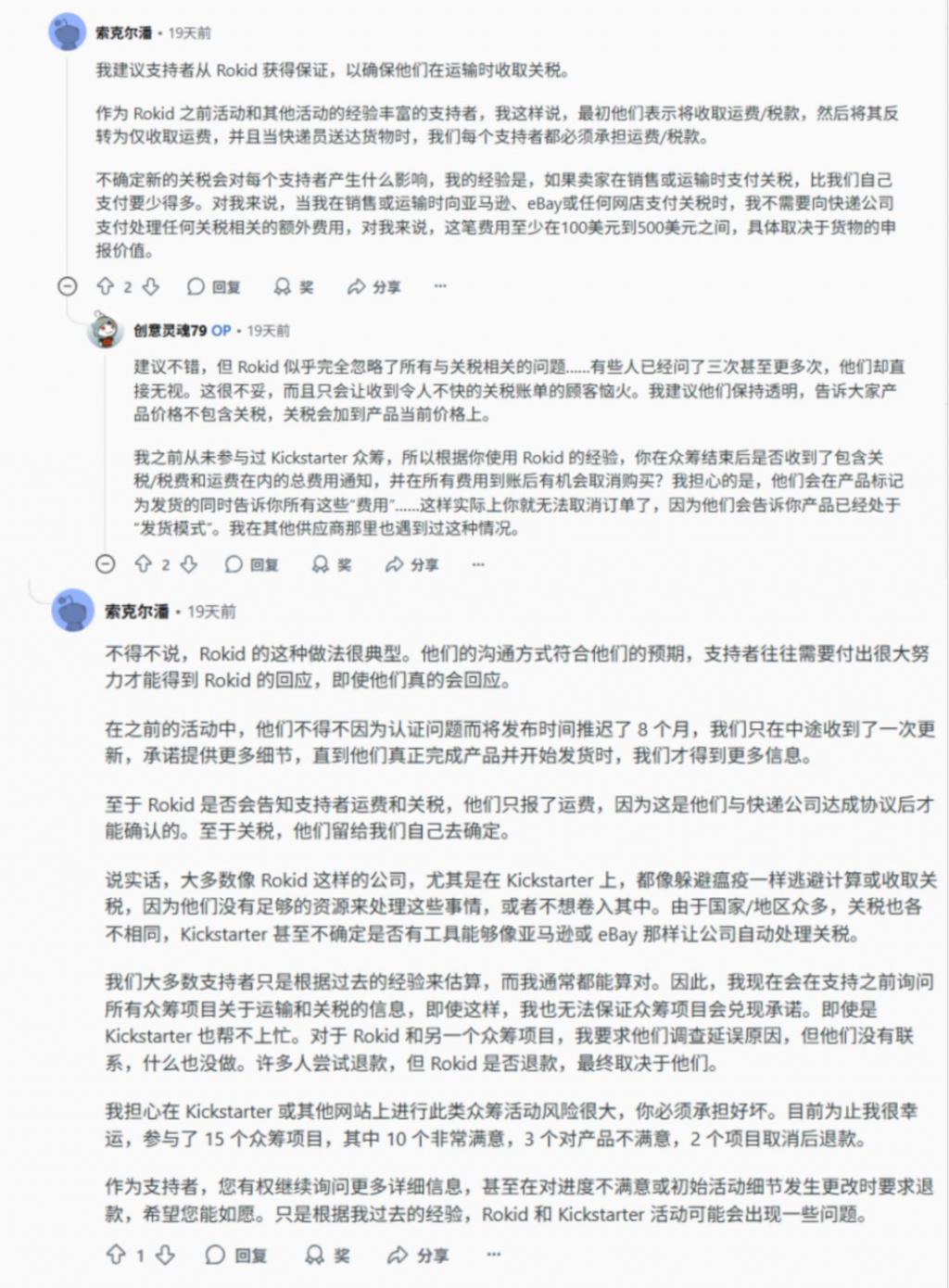 从社区讨论来看,一些参与海外众筹的早期支持者都遭遇了这波品牌信任打击。这种问题在 Kickstarter 并不少见,但正如一位老用户所言:"Rokid 现在的体量和节奏,已经不像是典型的早期项目了,仍然延续低沟通密度的处理方式,只会持续透支信任。"