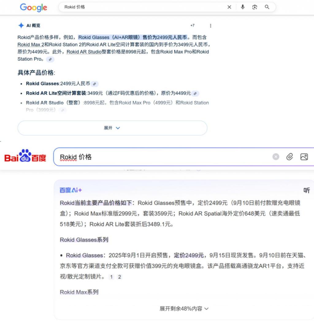 一个是天然占据了传统搜索和 AI 搜索两大流量入口的 2499 这一低位价格带关键词。「市象」实测发现,无论在百度还是谷歌,以 "Rokid 价格 " 为关键词进行搜索,AI 搜索与传统搜索展示的价格信息仍是发布会时的 2499 元。