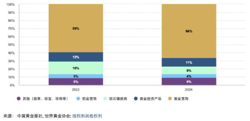 据世界黄金协会数据,各类珠宝对零售额的贡献占比变化中,钻石镶嵌类从 2022 年 7 月的 16% 降至 2024 年 7 月的 9%,黄金首饰则从 59% 增加至 66%。