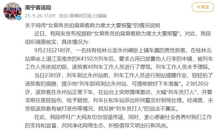 女乘务员拍肩乘客称力度太大要报警?南宁客运段发布情况说明