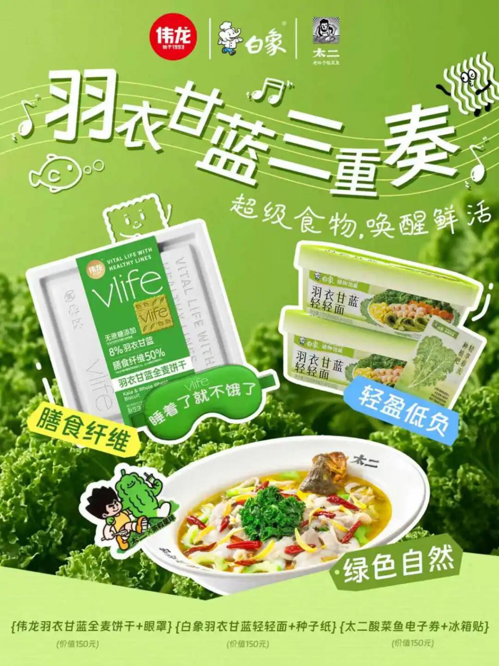 事实上,扩散效应并未止步于茶饮领域。羽衣甘蓝单品还撬开了更多行业和品类的大门,逐步构建出一个丰富的 " 羽衣甘蓝宇宙 "。
