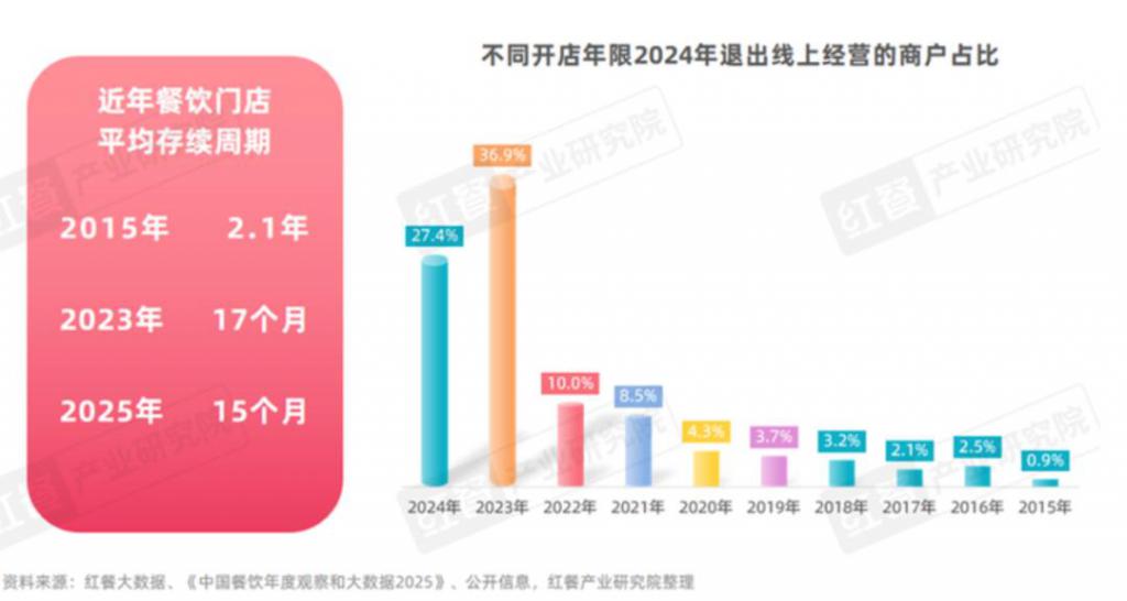 《中国餐饮年度观察和大数据 2025》显示,在 2024 年退出线上经营的商户中,开店年限不足两年的商户占比达到 64.3%。整体来看,餐饮商家的生命周期已经从过去的 2.1 年,下降到 15 个月。