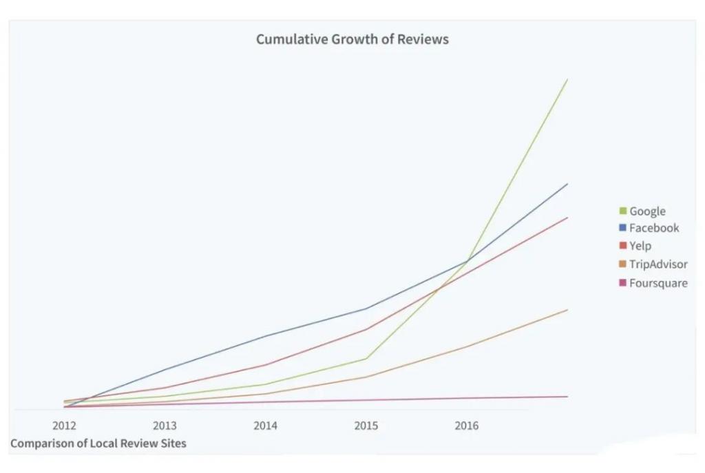从 2011 年推出类似 Yelp 的服务,到 2016 年,本地商户的评价数整体超过 Yelp,谷歌地图仅用五年就大获全胜。