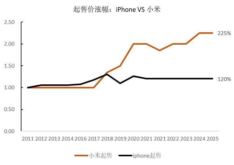 小米手机的十余代产品以来,从一开始的性价比定位到高端定位,其手机定价步步高升,甚至超过了苹果的同期涨幅。与此同时,尤其近五年来,苹果则 " 加量不加价 "。