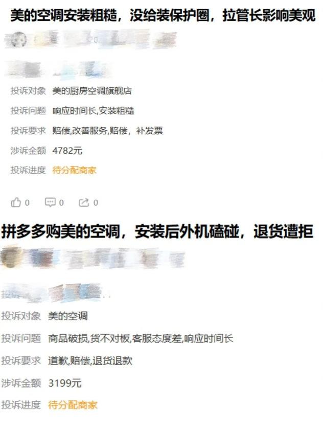锌刻度从黑猫投诉平台观察到,关于美的空调的投诉高达 8360 条,其中有人提及自己购买的美的空调迟迟无人送货,后来在安装空调时也是坎坷重重;也有人说购买的美的空调刚使用就坏了,要求启动 100 天只换不修服务,也被反复推脱,没有得到积极的售后态度;又或者是安装空调十分粗糙、因安装不当造成外机损伤……涉及各方面的投诉问题诸多。