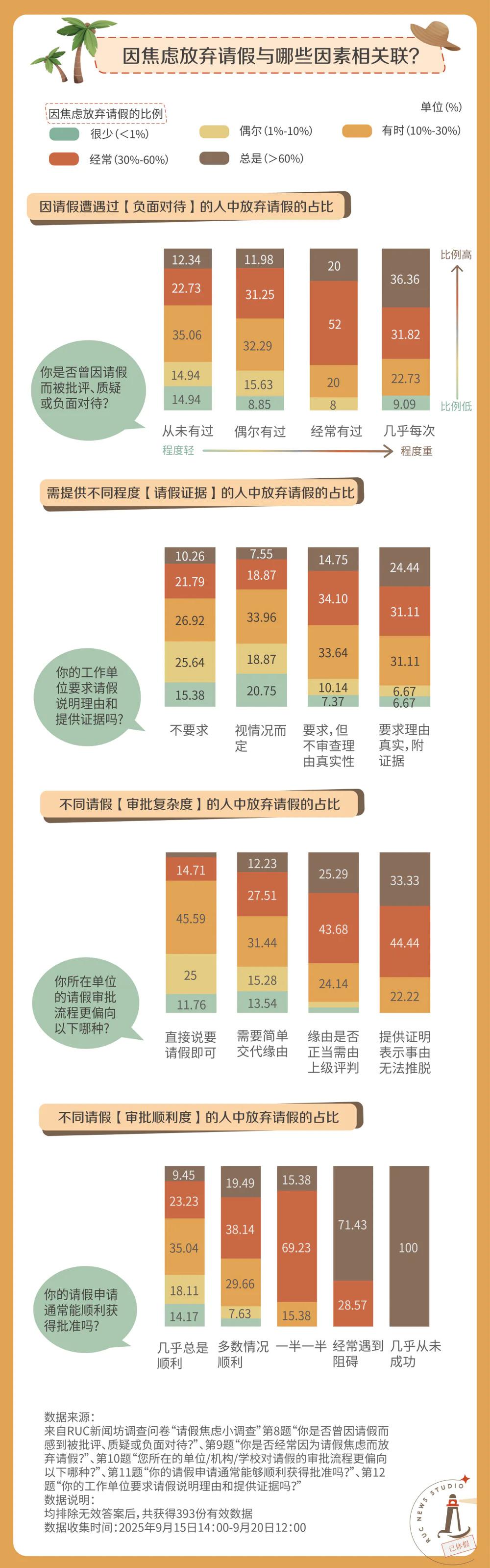 面对这一切的休假焦虑,许多受访者坦言,他们的应对方式就是干脆放弃请假,在复杂的职场生态中为自己争取有限的安全。经历的负面对待越多、请假证据要求越严格、审批流程越复杂,他们越容易选择隐忍。