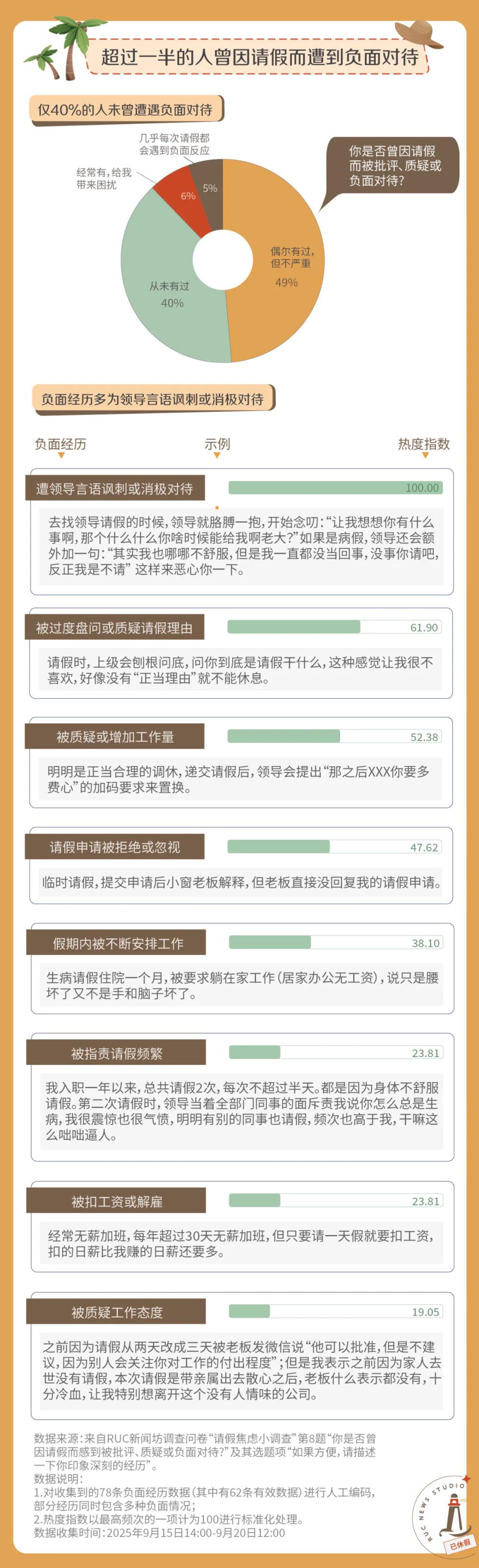 这些焦虑并非空穴来风,而是 " 吃一堑长一智 " 的教训。问卷结果显示,有超过一半的人曾因请假而遭受到言语讽刺、过度盘问、质疑、拒绝和惩罚等负面对待。