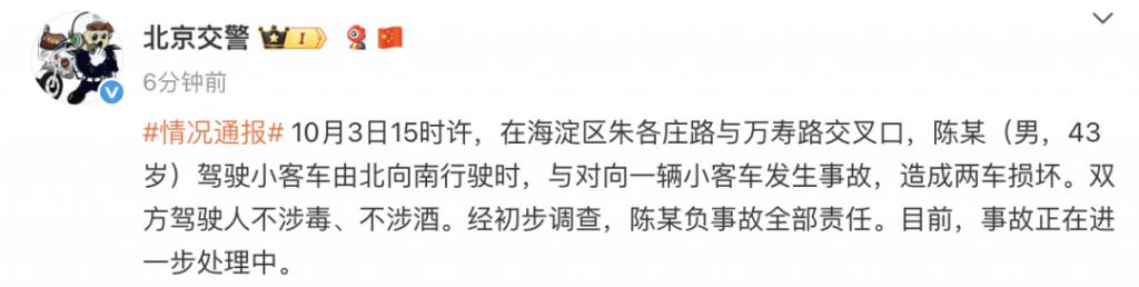 10 月 3 日 15 时许,在海淀区朱各庄路与万寿路交叉口,陈某(男,43 岁)驾驶小客车由北向南行驶时,与对向一辆小客车发生事故,造成两车损坏。双方驾驶人不涉毒、不涉酒。经初步调查,陈某负事故全部责任。目前,事故正在进一步处理中。