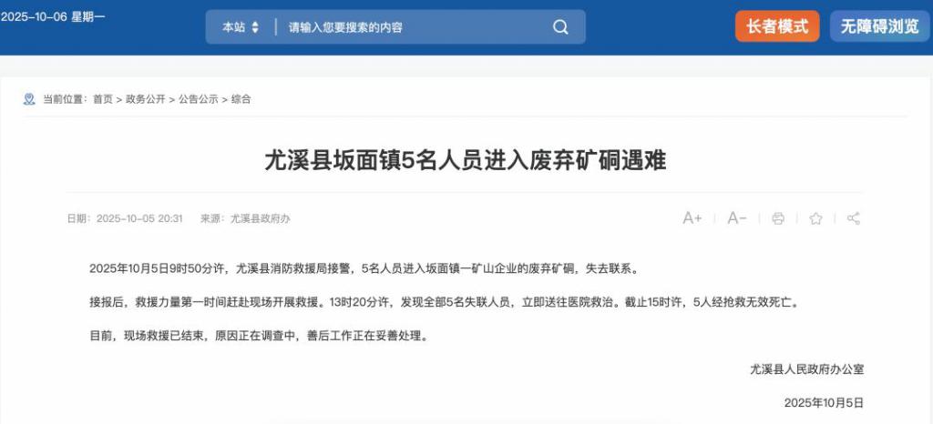 10 月 5 日,据福建省三明市尤溪县政府网站消息,当日 9 时 50 分许,尤溪县消防救援局接警,5 名人员进入坂面镇一矿山企业的废弃矿硐,失去联系。